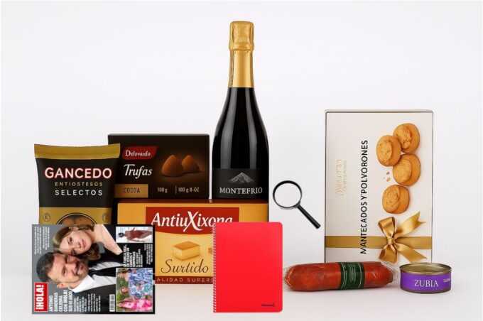 Un lote navideño original y con mucho humor, pensado para quien siempre está al tanto de todo. Combina vino, aperitivos gourmet, dulces tradicionales y detalles divertidos como revista, lupa y cuaderno, todo presentado en una caja personalizada perfecta para regalar entretenimiento y buen sabor.